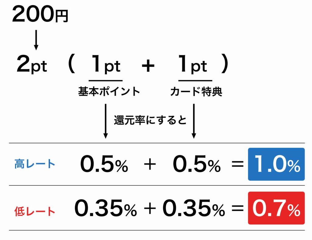 JCBが発行するカードは基本的に200円に対し1ポイントですが、JCBカードWはカード特典により1ポイント加算されます。