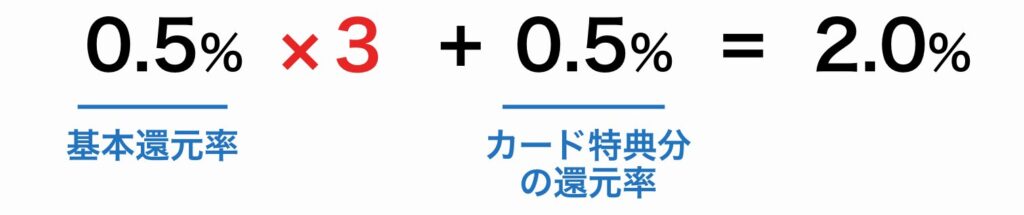 この3倍を基本還元率の0.5%にかけ、カード特典の0.5%をプラスします。